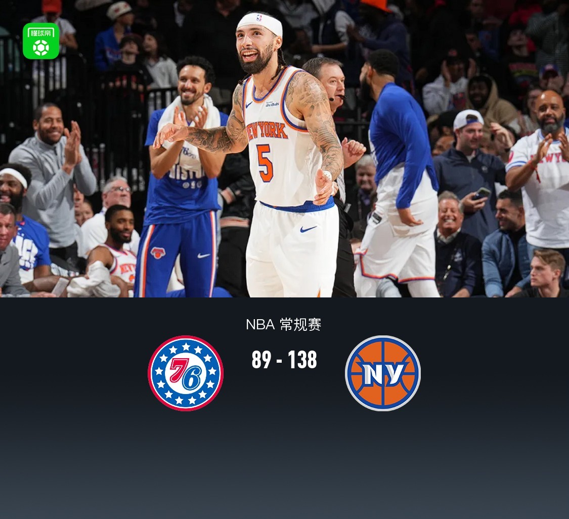 第四节76人博尚拿下8分,尼克斯阿尔瓦拉多拿下12分,最终76人89-138不敌尼克斯