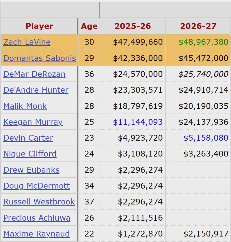 小萨博尼斯的合同是4年1.86亿美元,2028年夏天才能到期。本赛季小萨因伤只打了19场比赛,其中15场首发。场均出战29.7分钟,得到15.8分11.4篮板4.1助攻0.9抢断2.7失误,三项命中率:54.3%,18.5%,72.7%。