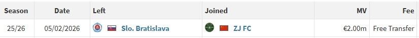 北京时间2月6日,据德转显示,布拉迪斯拉发中场托利奇加盟浙江队。