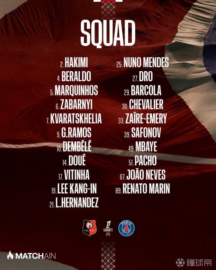 前锋:7-克瓦拉茨赫利亚、9-贡萨洛-拉莫斯、10-登贝莱、14-杜埃、29-巴尔科拉、49-姆巴耶