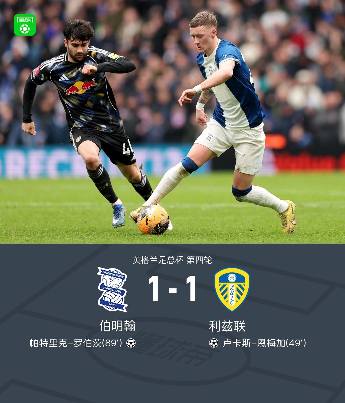 北京时间2月15日英格兰足总杯 第四轮,伯明翰对阵利兹联。伯明翰帕特里克-罗伯茨破门。利兹联卢卡斯-恩梅加破门。最终比分伯明翰 1-1 利兹联。