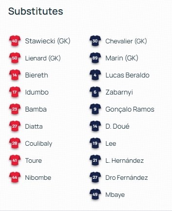 替补:30-舍瓦利耶、89-雷纳托-马林、4-贝拉尔多、6-扎巴尔尼、9-贡萨洛-拉莫斯、14-杜埃、19-李刚仁、21-卢卡斯-埃尔南德斯、27-德罗-费尔南德斯、49-姆巴耶