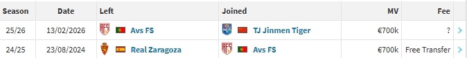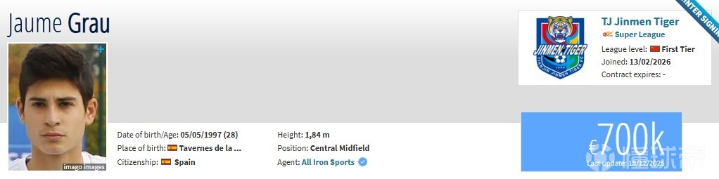 北京时间2月14日,德转更新,葡超阿维什镇中场豪梅-格劳加盟天津津门虎。