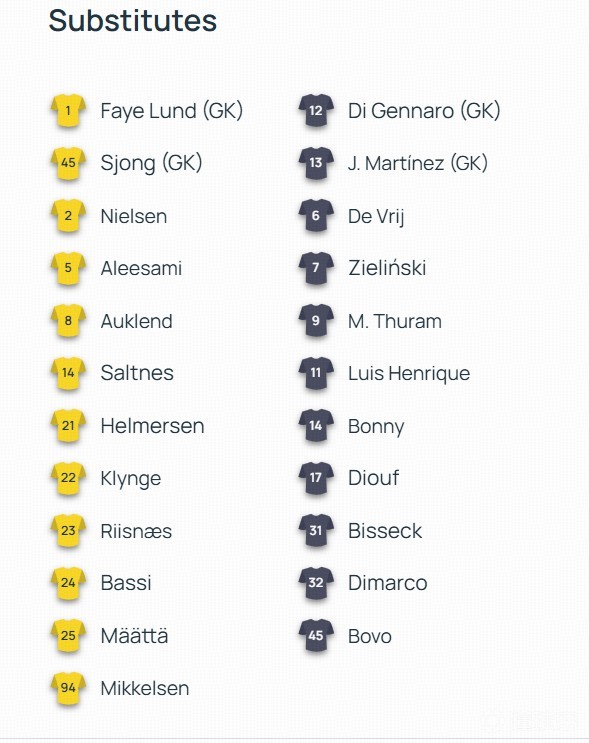 替补:1-朱利安-伦、45-伊萨克-雄、2-尼尔森、5-阿里萨米、8-奥克伦、14-萨特纳斯、21-赫尔默森、22-克林格、23-里斯奈斯、24-丹尼尔-巴西、25-伊萨克-梅泰、94-米克尔森